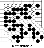 Reference 2: This is the final position in the lower right quadrant. Iwamoto maintained he did not need to capture the marked stone with A because he had more ko threats. Under current rules Black needs to capture the marked stone at the end of the game, but an obscure bylaw, which had not been revised since the Meiji era (1868-1912), ruled Iwamoto was correct. Still, it did not change the winner of the game and Go went on to win the series 7-2 with the remaining game a jigo (a draw).