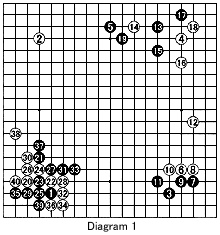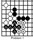 Diagram 1 shows one of the games during the tournament that involves a complicated variation of the Taisha joseki. Even top professionals do not know all variations completely. Problem 1 shows the corner position of that game. Can Black kill the marked white stones and win the semeai between the marked black and white stones? It is an extremely difficult problem that contains a series of tesuji (good local moves), which require a profound knowledge and reading skill at a professional level. We will try to solve this problem in the coming weeks by discussing a number of these tesuji.