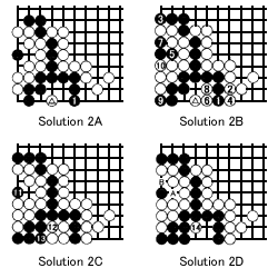 Solution 2A: After the marked white stone, black 1 is the correct answer. Solutions 2B through 2D show what happens next.