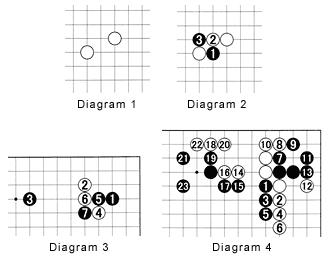 Diagram 4: White has no choice but to play 2. Pushing with 3 and 5 next is a good strategy, after which Black should defend the corner with sequence 7 through 13. White now has a problem of breaking through to the center. If he wants to solve the problem by making eyes, he can, in the sequence to 23, but this gives Black a better result. There are a few alternatives for White, but we won't go into them now.