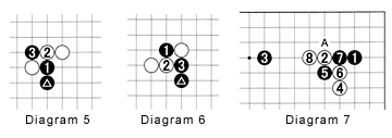 Diagram 7: Here is an example of the type 2 cut. After white 4, black 5 and 7 constitute this type of cut. White could now play at A, but this would revert back to Diagram 3. White is probably better off extending to 8--again this will lead to a heated battle.