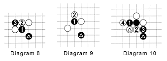 Diagram 8: This is a no-no--try to avoid this type of cut! In professional games, you will rarely see a mix of type 1 and type 2. If the marked stone is located as in type 2, Black will almost never initiate the cut shown here.