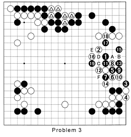 Problem 1: This is the game in which Yoshio Ishida (Black) took the Honinbo title away from Rin Kaiho in 1971 when he was 22 years old. How should White defend against black 3?