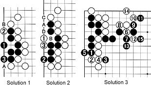 Solution 3: Again, everything depends on who moves first. As can be seen in the previous two situations, Black needs to play at 1 and 5 to live. After that, White plays on the upper side to ensure life for his stones in that area. Note: White needs white 20 or A in Problem 3 to be able to play 2 (otherwise he would be cut at 4).