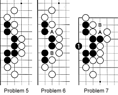 Problem 7: Isn't black 1 a mistake (see Reference 2)? And what happens if Black exchanges A for white B?