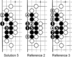 Reference 4: For Black, it is even possible to play at 1. White 2 is the strongest counter, but in the sequence to 9, Black lives by the skin of his teeth. As a matter of fact, he gets much more territory than in Solution 6, but that is only because White should have played differently.