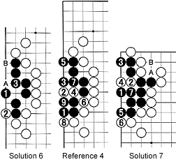 Solution 7: Black 1 works because of the intricacies of the corner. So, after white 2, Black can play at 3. If white plays at 4, black 5 ensures life. Note that if Black had exchanged A for B, he would not have been able to play at 7 in response to white 6, because of a shortage of liberties.