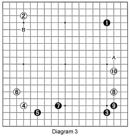 Diagram 3: This situation occurs frequently. The fuseki (opening) strategy to 7 is commonly employed and one of my favorites when playing Black. A white approach at 8 is also common in response. Black 9 initiates a joseki (standard corner exchange) in which white 10 is the usual move. The question is should Black now play at A or B?