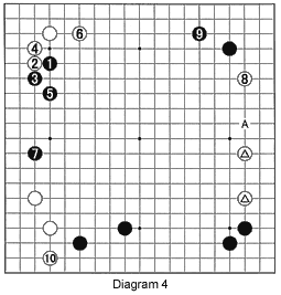 Diagram 4: If Black prevents a white shimari in this area by playing at 1, the moves to 10 are a possible continuation. The exchange white 8 for black 9 strengthens the marked white stones even if it does not prevent a black invasion at A. However, it will be White who takes the initiative in that case--after all if Black plays at A, White's stones form a 3 to 1 material majority. Somehow, it looks as if White got the better part of the deal.