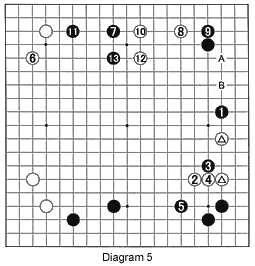 Diagram 5: On the other hand, if Black starts an attack with 1 to confine the marked white stones, a continuation to 13 as shown here is a possibility.