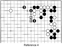 Reference 4: In theory, white 2 is better than the exchange of white B for black C. Black still needs to defend against a white cut at A. Black 3 is one way of doing that. This means White takes the initiative in the center. This probably would have been better than what actually happened in the game.