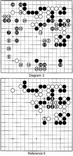 After white 24, the sequence to 28 is forced. Next, Black attacks the other groups with 29. White 38 was the next move discussed (see Reference 4).