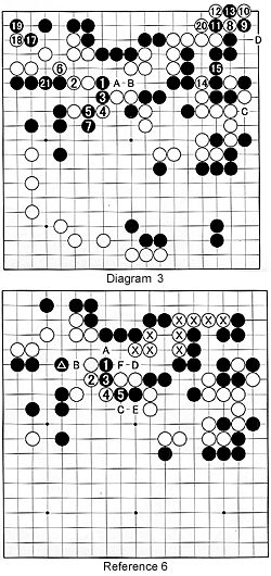 Reference 3: (Note: After the marked stone is taken with black 5, black 7 would be played at this spot.) The combination white 2, 4 and 6 make sabaki. By sacrificing the marked stone, White's stones tesuji, thus making good shape, and Black's stones are on the inside while White's stones are on the outside. Takemiya liked this because White can make a good shape, while Black's shape is poor. However, Black can always play later at 9, and White would be unable to play at A, because Black would cut at B. In other words, White gets no territory, but he gives a lot to Black. So, theoretically, it is a good choice, but actually White loses too much territory.