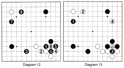Diagram 13: Instead of defending the marked white stone, White has a better option--not defending, but answering with 2. And if Black captures the marked stone with 3, White can keep up the tempo and move to 4. This is the way ko is usually fought between stronger players--they like to win it, but not at all costs. And they don't mind losing it if there is reasonable compensation.