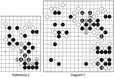 Diagram 2: At this point, White has the choice of capturing the stone marked X or cutting off the stones marked with triangles. But considering that capturing two stones by playing white 10, 12 and 14 also frees the white stones marked with triangles, White's choice is obvious. On the other hand, Black plays a ko threat with 13 and completes the capture of the white group in the lower right corner by playing at 15. What should White do next? Should he capture the marked black stone?