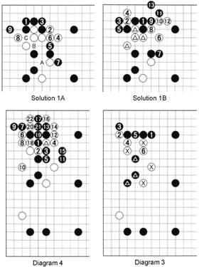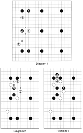 Problem 2: Black 1 and 3 are the right way to cut a keima (D in Diagram 2). The moves to 6 follow. How should Black respond to the cut at 6?