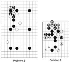 In other words, after white 4 in Problem 1, Black can repair the defects in his shape by connecting on either side. It would be a mistake for Black to worry too much about his stones on the left side and let White have the upper left corner.