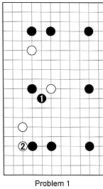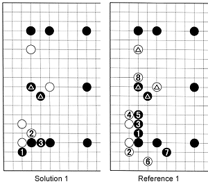 Problem 2: This is a follow-up to Solution 1. After black 3, white 4 seems a good move. Black 5 now looks natural, but after white 6, Black is completely hemmed in. Something went wrong somewhere. But when and where?