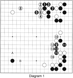 Reference 3: The moves from 2 through 10 are a tesuji combination, but so are the moves black 5 through 9. The result is decided by the ladder Black starts with 7, 9 and 11. In the game, the ladder is bad for White, meaning White cannot play the combination 2 and 4. Instead, he could have played a ladder block at A in Diagram 1. Black will have to answer in the upper right corner, giving White an extra move to make a double approach at B. The result is reasonable for both players.