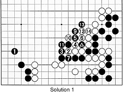 Solution 1: Black should have played at 1. But he was worried that White would escape with the sequence starting with 2. But Black squeezes the white stones in the sequence to 7, then extends to 9, after White plays at 8 where the marked stone is. If White wants to keep Black's stones separated, his only choice is at 10 and 12. But that means he will get an even bigger dango--the ultimate bad shape--when he is forced to connect at 14.
