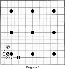 Diagram 3: After the handicap stones are on the board, White plays the kakari (approach) at 2, which is a standard move. This week we will look at black 3 as a response. Note that this does not protect the corner. White can still invade with a move like 4. Black must play at 5. Now White can either play at B or play a hane at 6. The latter being the most popular, let's investigate possible responses for Black. His only options are A and B.
