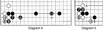 Diagram 6: Black 11 is a steady move, although the cut of white A, followed by black B and white C remains. However, with the marked stone in place, there is no reason for Black to panic after that cut.