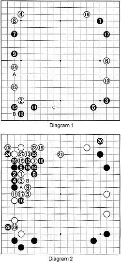 Reference 2: Instead of 17 in Diagram 2, White should have extended to 1. Black would cut with 2 and escape with the sequence to 8, but after 9 and 11, White need not worry--he can put up a good fight here.