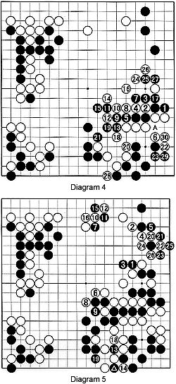 Diagram 4: Black 1 is the strongest move because it keeps White split. White has no choice but to keep on fighting. White cannot cut at 17 instead of 6, because Black will cut at A and then the whole white group in the lower right corner will most likely suffocate. Up to 28, White has no choice. He needs to fight on two fronts, his center and the large group around 18 and 20, which he must keep alive. However, this group is saddled with a fatal deficiency. How can Black attack this group?
