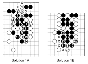 Solution 1B: Along the way, there are some minor pitfalls, but the last problem is posed by black 23. Do not follow Reference 4. Thanks to the moves leading to black 23, Black finds himself with four liberties--marked by the crosses--against White's three liberties. No matter where White plays next, Black can win this capturing race by one move.