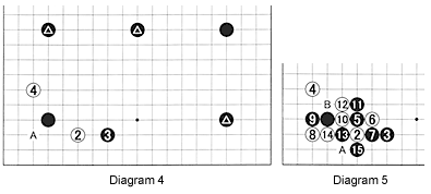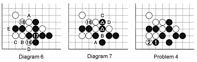 Problem 4: If Black plays at 1 (similar to B in Diagram 6), White should not block at 2. If he does, how should Black proceed? The answers to this problem and Problem 3 will appear next week.