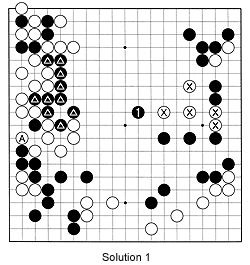 Solution 1: White's last move was at A and Black played his next move at 1. This is an excellent move as it influences the whole board. First, it attacks the marked white stones on the right. Second, it strengthens Black's marked stones on the left. Third, it threatens to make territory in the center.