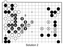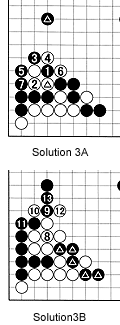 Solution 3B: White has to connect at 8. However, this gives Black a good move at 9 as it takes away a vital white liberty. Even after white 10 and 12, Black just hangs tough and answers every forcing move. It is extremely unlikely that Black will lose either of his two marked groups. Besides, if White does not defend his corner quickly, he dies. In other words, White's cut (the marked stone in solution 3A) is an overplay.