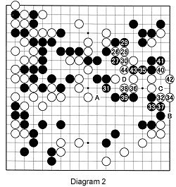Diagram 2: White starts out creating defects in Black's shape by cutting at 26 and making the beginnings of eye-shape with 30. Black 31 is not an elegant move--that would be A--but it defends against a possible white cut there while eliminating bad aji (potential). Threatening to connect at B or build an eye at C, white 32 and 34 are a clever combination. Black 37 is questionable. He should have played at 43--then White would have to connect underneath at B, and later Black could capture four stones with 44. In the game, White lives with the sequence to 42. These moves make miai of playing at C to make two eyes immediately, or to defend the eye at D, should Black play at C. Either way, White has two eyes. This concludes the second stage of the fight that erupted after black 1.