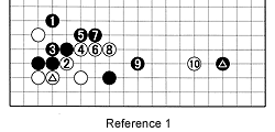 Reference 1: Wrong! After White's marked move, Black often plays something like 1. However, White can now break into the center, for example, with 2 through 8. If Black then defends his lone stone with 9, white 10 attacks these two stones and the marked black stone at the same time.