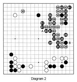 Diagram 2: White 28 is one step too far. He should have played at 33 instead, probably followed by black 29. This would have expanded White's influence and pushed back Black's. However, after white 30, Black strikes back at 31 to isolate white 28. Against this obvious move, White had prepared the cut at 32. Though a cut at 34 was anticipated, Black unexpectedly cut back with 33 and 35. Reference 1 shows a more natural sequence. Although Black has taken the initiative in the center, he should have followed the sequence in Reference 2, instead of playing at 39. In the game, 40 is a resilient move, giving White a good shape and leading to the sequence to 66. After this move, White is completely alive and Black has run out of steam. In addition, he has a weakness at A and he has lost about five points because White can play at B (see Reference 1).