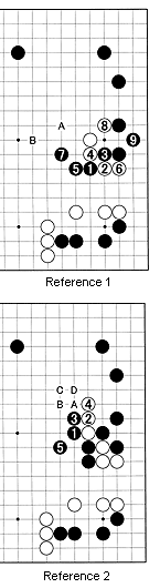 Reference 1: Black 3, white 4 and black 5 are a more natural way to cut than the moves played in the game. After black 7, white 8 hits the vital point of Black's shape, but after black 9, White will have to move into the center by playing at A, for example, followed by a black move around B. Note the difference in Black's territory on the right.