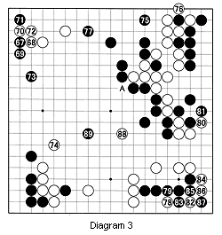 Diagram 3: Black invades the upper left corner with 67 through 73. White 74 enlarges White's moyo (potential territory) on the lower side while pushing back Black's stones on the left. Black 75 and 77 make eyes and territory, which moderates the threat of a white cut at A. At the same time, Black is hoping for an attack on the upper left corner, which in turn indirectly strengthens the black stones 67 through 71.