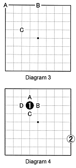 The purpose of this game is to capture one stone or more. Black could play at 1. This stone has four liberties, at A, B, C, and D. White could use his first move by playing at 2.