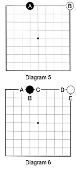 Diagram 5: How many liberties do the black stone A and the white stone B have?