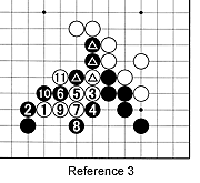 Reference 3: What was the threat behind white 1? When Black answered with 2, White was able to wreck the ladder and played 3. If Black insists in playing the ladder, White gets three liberties the moment he plays at 9. If Black tries to stop the gap with 10, white 11 puts him on the spot. The marked black stones are lost now and White's stones escape.