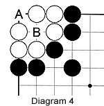 Diagram 4: This white group is alive because Black cannot play at A or B, so he cannot take away White's last liberty. This is similar to Diagram 1.