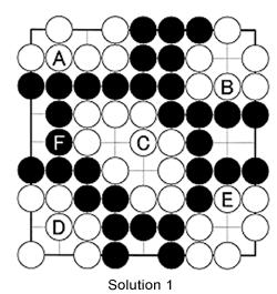 Now, reconsider groups E and F. Neither is alive, but they are adjacent groups. If Black plays first, he is able to follow Solution 2C, freeing his F group. However, if White moves first he can follow Solution 2D and kill the black group at F, setting his group at E free. In other words, the outcome can be decided by whose turn it is.