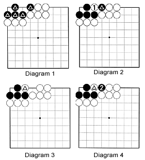 Diagram 4: Stones with no liberties are dead and must be removed from the board. The black stone at A, for example, is dead.