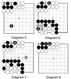 Solution 3: The white invasion, starting with 1 through 5 is very common. However, it has some scary consequences. In response to black 6, White has to start a ko with 7.