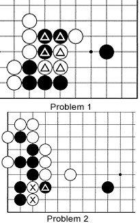 Problem 3: The marked white stones have only one eye. To free them, White must capture the marked black stone. How does he do it?