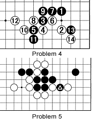 Problem 5: This is a great double ladder problem. Black has just played the marked stone--a grave mistake. How should White counter and capture the black stones?