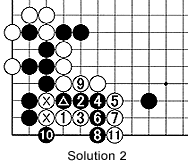 Solution 2: The combination white 1 through 5 sets up a loose ladder for White to capture the marked black stone and set his own marked stones free. After white 11, Black's five stones are captured and his corner group dies as well.