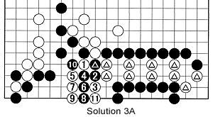 Solution 3A: To free his marked stones and capture the marked black stone, White cuts with 1 then sets up a loose ladder with 3 through 11.