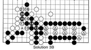Solution 3B: (Black 18 connects where 15 is captured) Black first connects with 12, but White keeps squeezing with 13. Black looks safe when he plays at 14, but white 15 is the coup de grace. If Black captures with 16, white 17 through 21 will finish him off. Instead of capturing with 16, Black could also play at 17, White would answer with A and Black would capture with 16. But after a white move at 20, Black would be left without options and uncaptured stones.