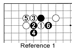 Reference 1: White likes to play at 1, but he is at a loss when Black wedges in at 2. The only way White can get a good result is by cutting and connecting with 3 and 5. However, at this point, Black can set up a ladder with 6. White 10 and 12 in Diagram 1 combine to break this ladder and it is the reason Black invades the corner with 13.